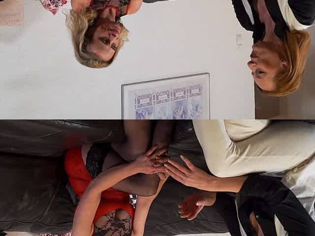 Older golden-haired woman with a perfectly hairless cunt is about to have anal sex with her stud