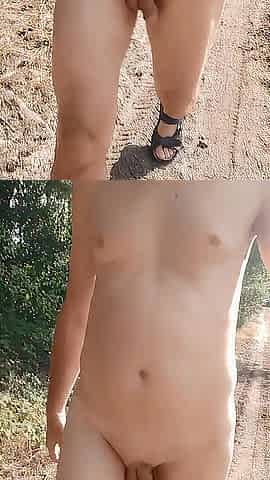 I take off my garments, leave 'em and walk in nature's garb along the road at the edge of the forest
