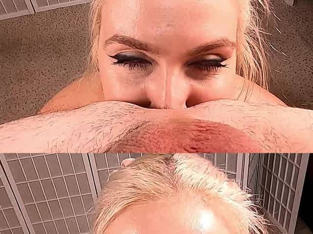 Beautiful Blonde Sucking and Handjob in Latex Gloves - Cum on Face and Tongue