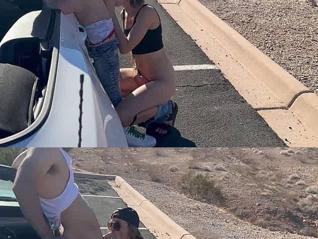 Wife Fucked / Spit Roasted by Two Guys and Receives Creampie on Road in the Nevada Desert