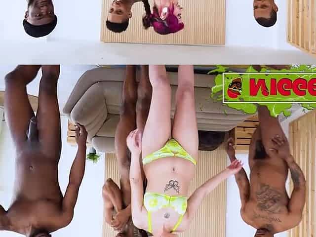 Randy bitch in gangbang gets face fucked and her cunt banged