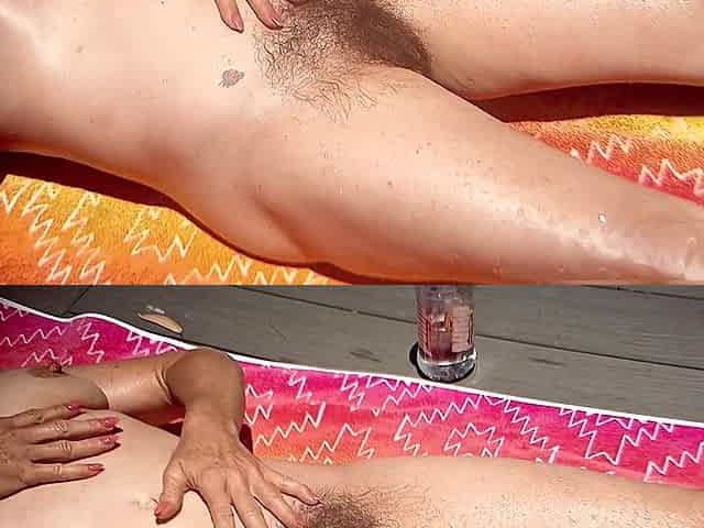 Wild unshaved mature lady sunbathing and enjoying her big hairy pussy - cumming and squirting