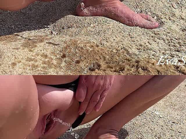 Messy lady public pissing standing on in nature's garb beach - rate my void urine outside
