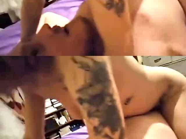 Blonde Threesome: Tattooed Beauty Begs For Cum From Both Guys
