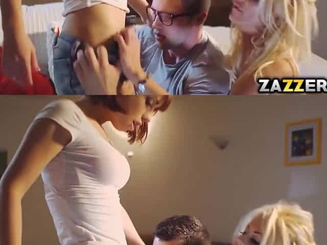 Amazing teens sharing dick in casting threesome