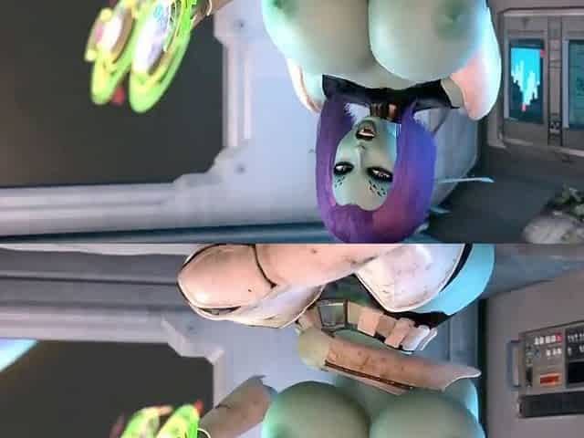 Sultry alien babe uses a spaceship control panel to enhance her amazing boobs