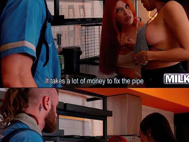 Two pretty friends with big asses let the plumber fill their asses with milk as payment for his services