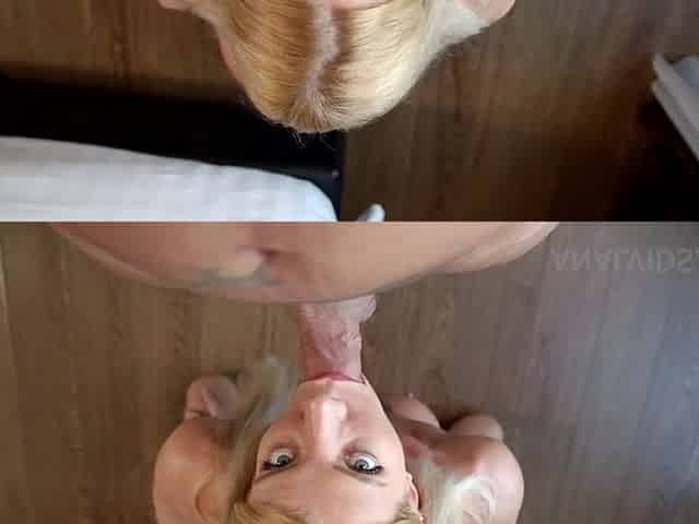 Blonde Babe Deepthroats While Ass Fucking Self With A Dildo