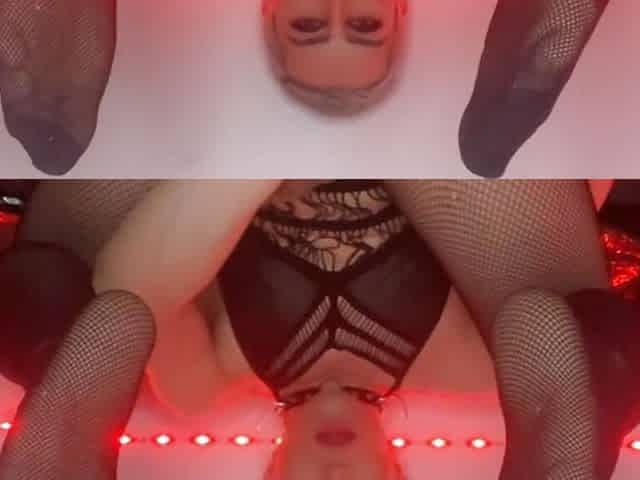 Sexy femboy in bodystocking and heels makes use of his 3 set dildo and fingers