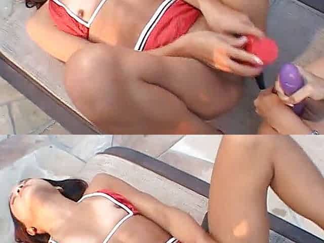Asian teens dildoing pussies and ass holes on the poolside