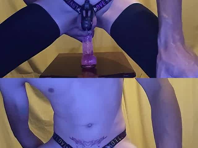 I put the tip of his dick in my ass while fingering my wet pussy and make this dildo fit in me