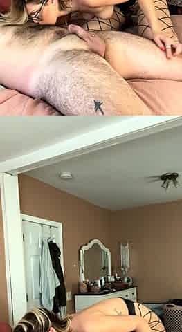 She is sucking on the dildo while he penetrates her asshole