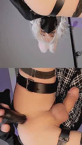 Cute femboy jerks off his butt and cums close-up