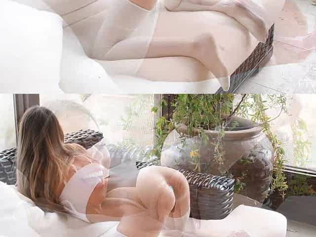 Mia Bangg moves her pants to the side so that 2 knobs can stretch her