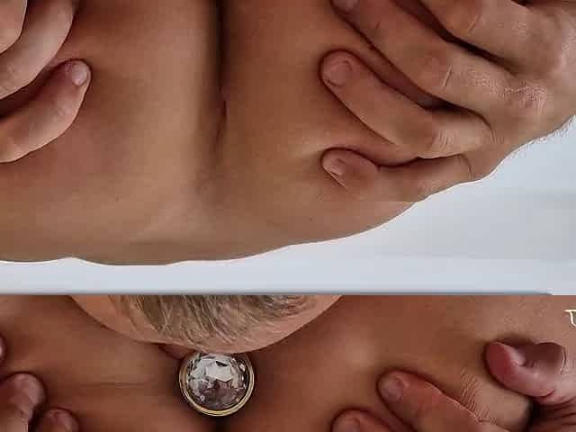 Wife takes a butt plug in her ass and enjoys tongue while sucking her husbands cock - close up view