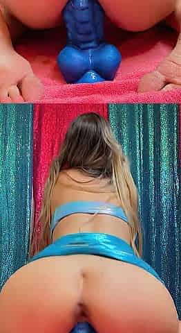 Girl with blue hair gets her first booty bang with a creampie