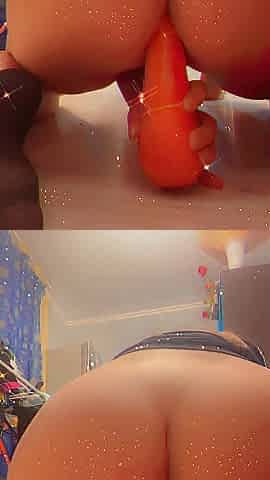 small Oriental riding my 1st real anal sex-toy ever — bouncing butt on it — view from behind