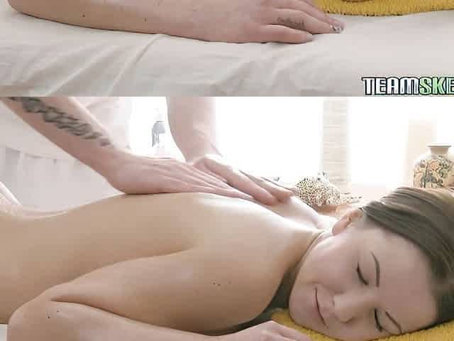Pale skinned petite chick Argentina gets her kitty stretched in various poses by horny massage therapist