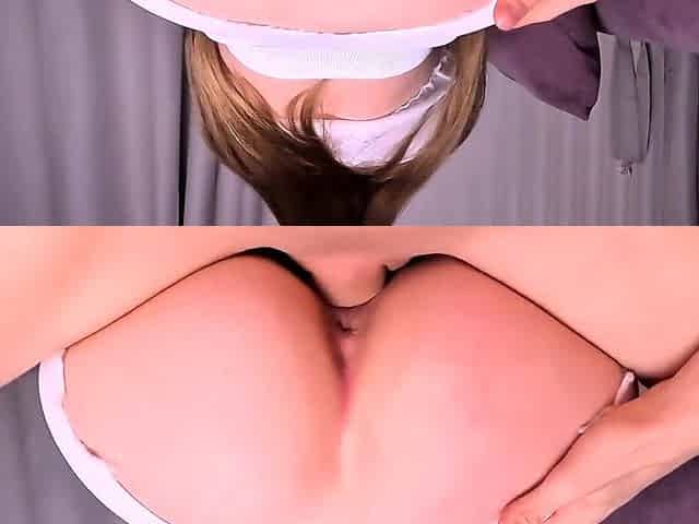 Teen Oriental tgirl with blue eyes pulls out a tiny cock on