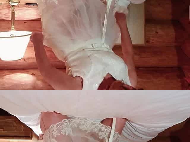 Redhead ladyboy in white dress exposes her trimmed cock and
