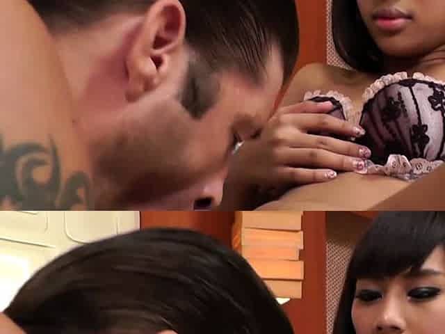 Slim ladyboy in lace panties gives a blowjob to his lover