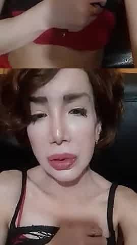 Busty ladyboy with red lipstick jerks off wearing black string panties