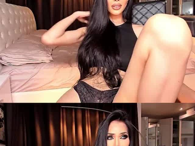 Brunette Hair ladyboy in ebony nylons plays with her monster