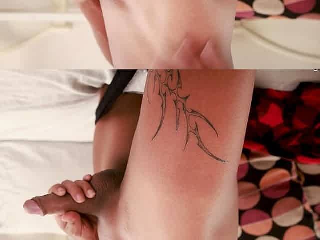 Tattooed ladyboy with a small cock gets fucked in reverse