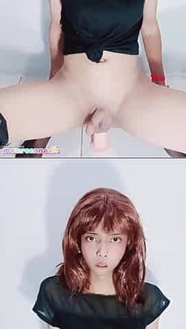 Cute oriental transsexual Mina cums on a biggest sex-toy anew