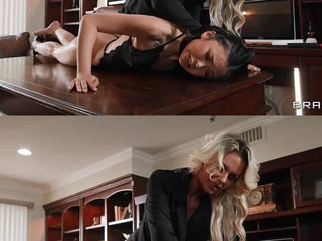 Busty brunette Asian and Cleopatra enjoy lesbian sex and strapon
