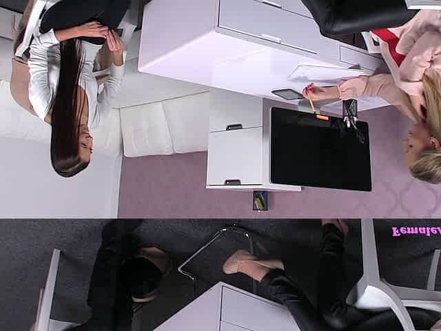 Asian lesbian and straight girl office sex