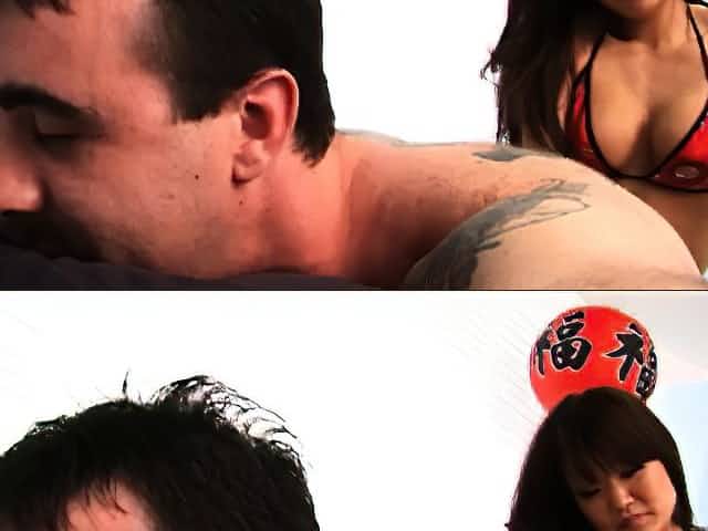 Asian model in swimsuit spreads legs for lucky guy in the water