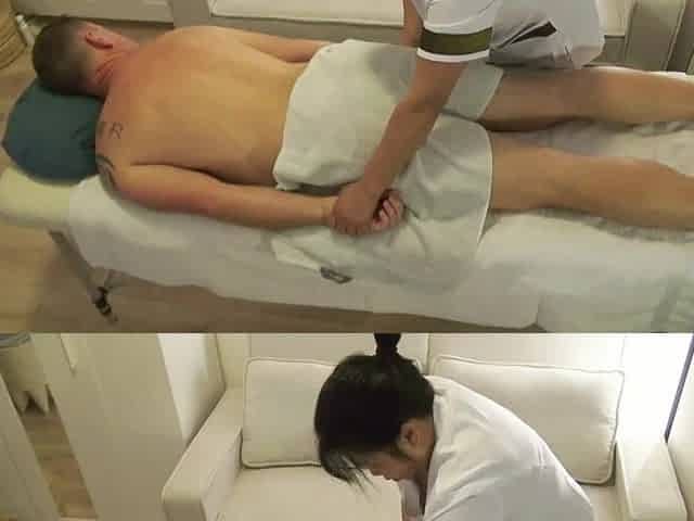 Busty Asian Milf gives a handjob and blowjob after a massage