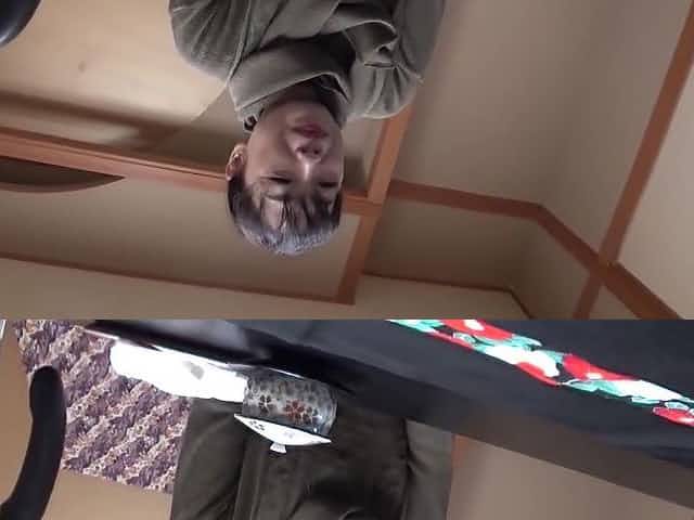 He lends this asian slut a hand with her mature pussy
