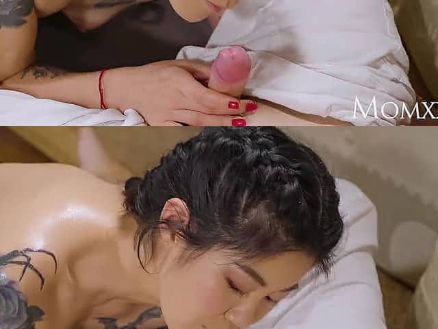 Tattooed Asian babe provides her man with the best ever yum-yum blowjob