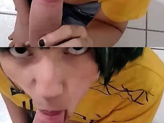 Garota cosplay faz boquete e bebe esperma em cena