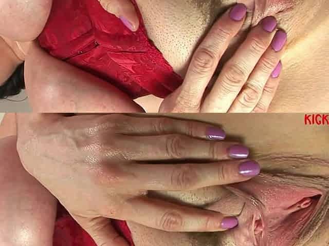 Good mature in stockings Scarlet Martini plays with her shaved pussy