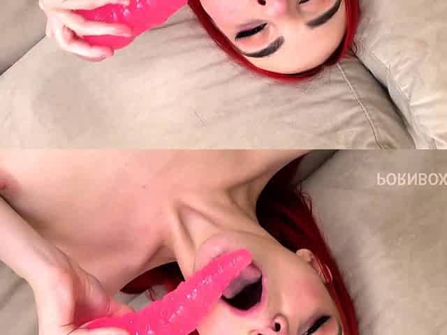 Redhead cheerleader Angelica Heaven gets playful with a fake penis while teasing her pussy