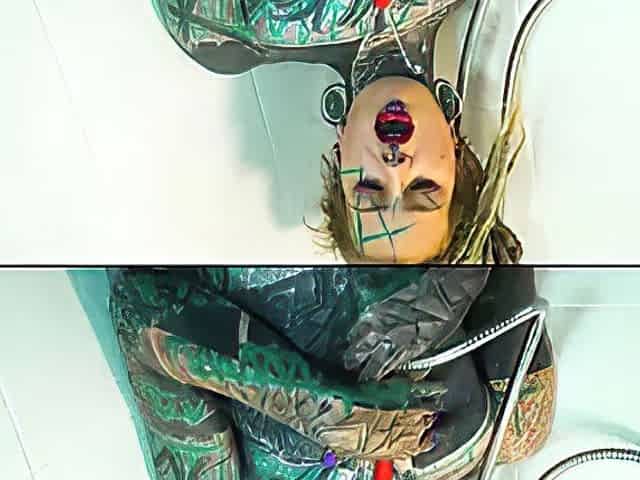Heavily tattooed Anuskatzz fucks her ass in the shower