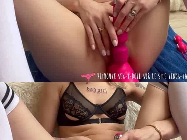Stunning platinum-blonde French babe shoves a huge dildo in her pussy and gets her ass fingered to climax