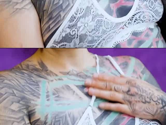 Tattooed model Nahluu doing her first porn