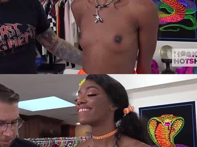 Tattoed girl wants to stretch her tight asshole and asks a man with a big fat dick to fuck her