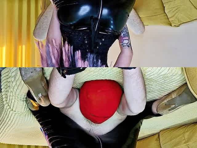Femdom facesitting with latex butt for unsightly serf in mask. Butt worship
