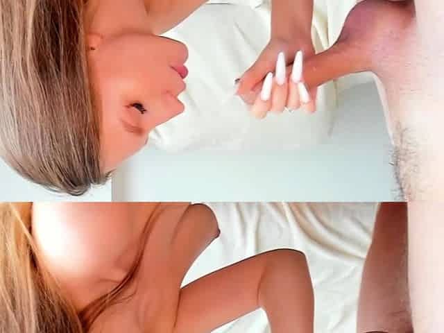 Gorgeous blonde teen whore giving awesome big cock handjob