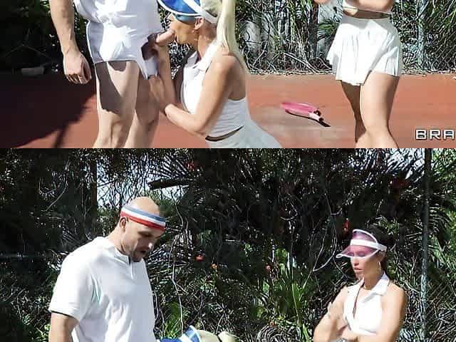 Awesome double blowjob interracial session with hot brunettes