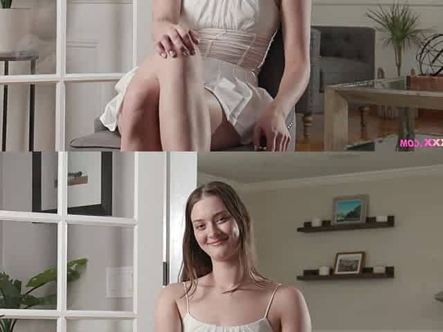 Stripteasing teen slut opens her skinny legs wide