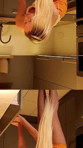 Hot Sexy Long Legs Beauty Cute Blonde College Girl in a Very Short Skirt to Flash Her Ass and Pussy in the Kitchen