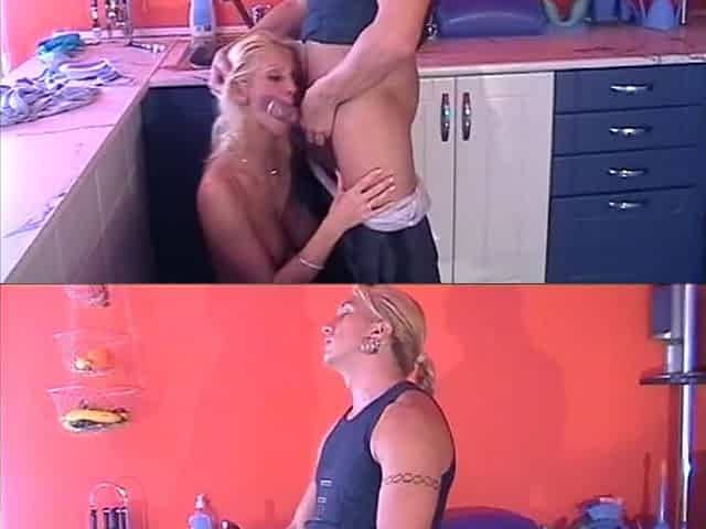 Blonde mommy enjoys sucking on two thick cocks together in threesome