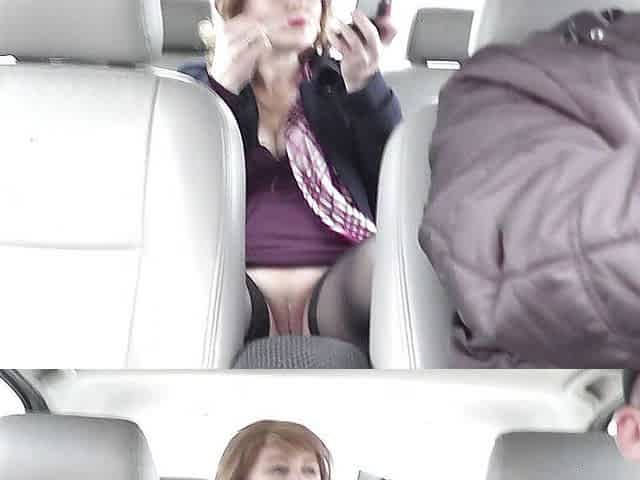 Sexy mommy MILF stopped taxi and rides in backseat auto taxi in stockings without panties.