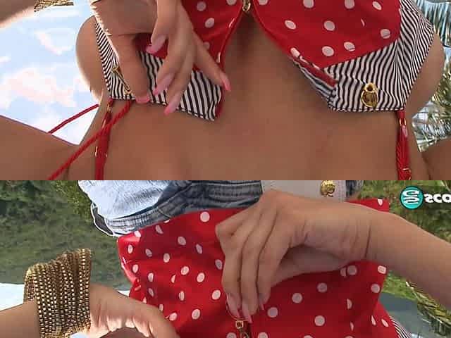 Brunette in leopard bikini strips on exotic balcony